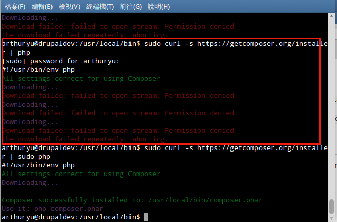 要注意的是,如果沒有在 php 前面加上 sudo 的話,就會出現上圖上半部的錯誤訊息。